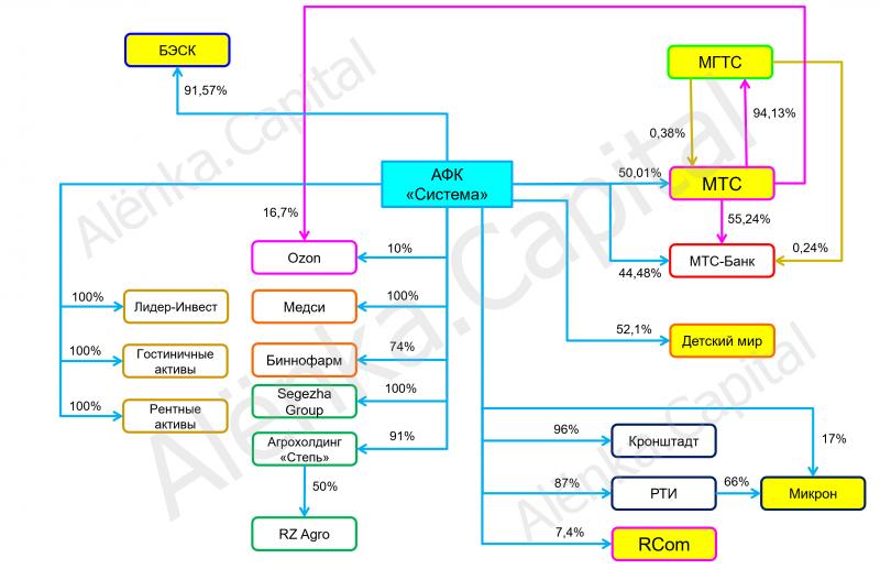 Как вы видите на схеме активов у АФК “Системы” в МТС лишь 50,01% акций.