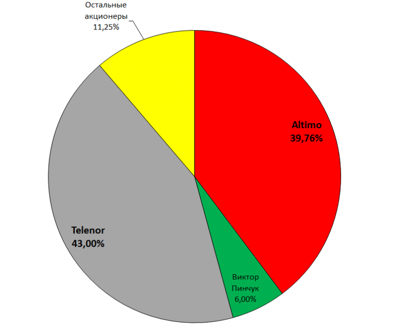 У Telenora 43% акций, у Altimo с учетом доли Пинчука 45,76%. Ключевая идея была в том, что два стратега будут скупать акции сотового оператора на бирже. Подобный трюк они уже проделывали со старым Вымпелкомом. Акции миноритарных акционеров должны быть на вес золота и постепенно взлететь до небес. В августе Altimo купило часть акций у Савриса увеличив долю с 25% до 39,5%, до этого в феврале докупал Telenor с 25% до 36.36%, а потом еще и в апреле купил через JP Morgan до 39,5%.